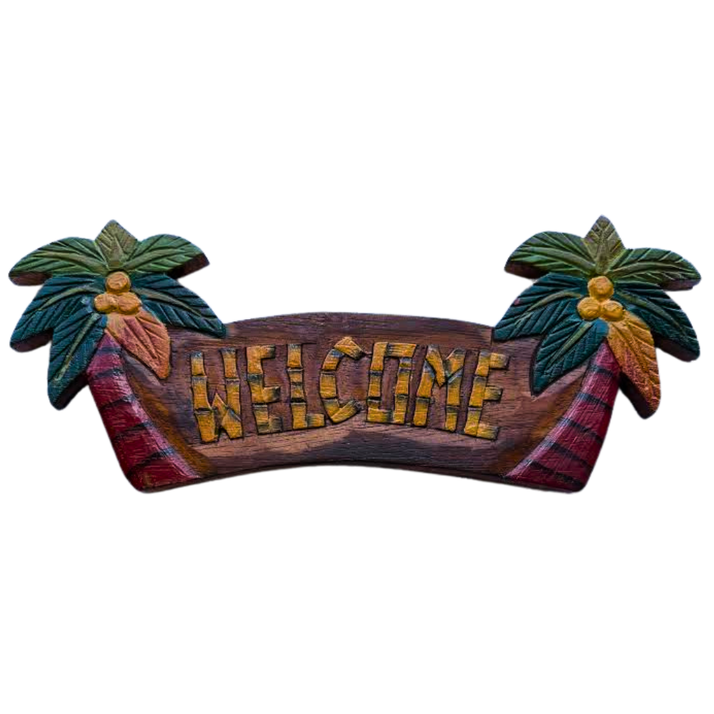 Hand-Painted “WELCOME” Palm Tree Sign – Tropical Wood Wall Decor (WP-35W)