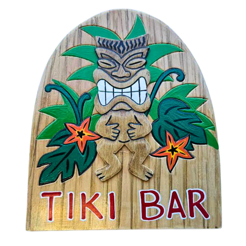 Hand-Carved “Tiki Bar” Wood Sign – Tropical Wall Decor with Tiki Figure and Flowers (WP-404)