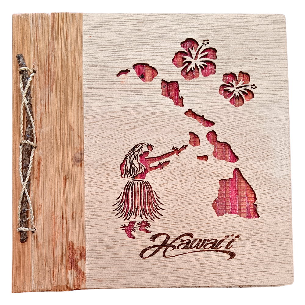 Handmade Natural Wood Photo Album – Hawaii Hula Girl & Islands Design