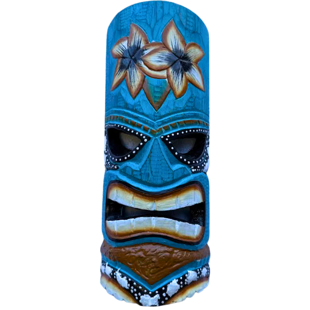 Hand-Carved Blue Hawaiian Tiki Mask with Plumeria Design