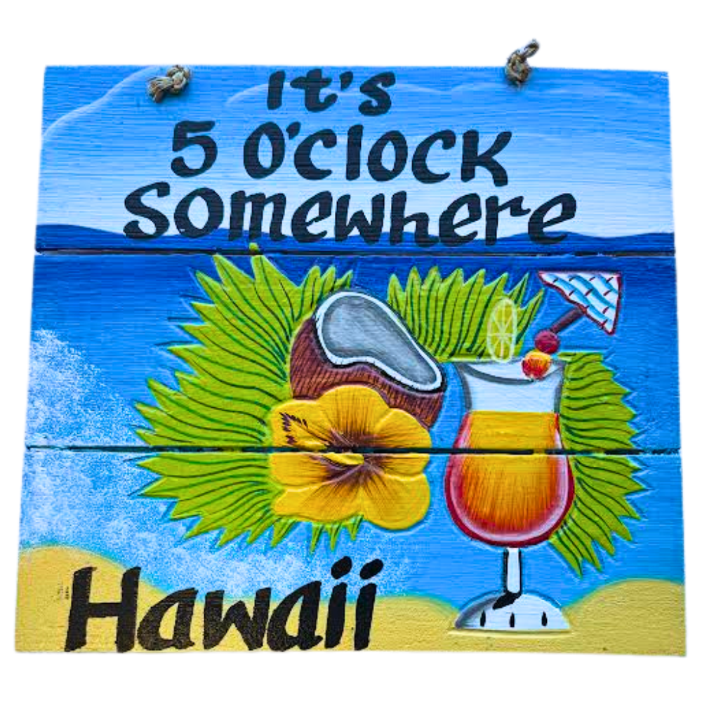 It’s 5 O’Clock Somewhere Hawaii Wooden Sign – Tropical Beach Bar Decor (WP-420)