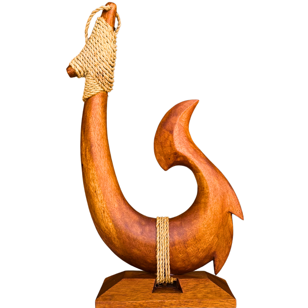 Hand-Carved Hawaiian Fish Hook Statue – Classic 10" Makau on Wood Base