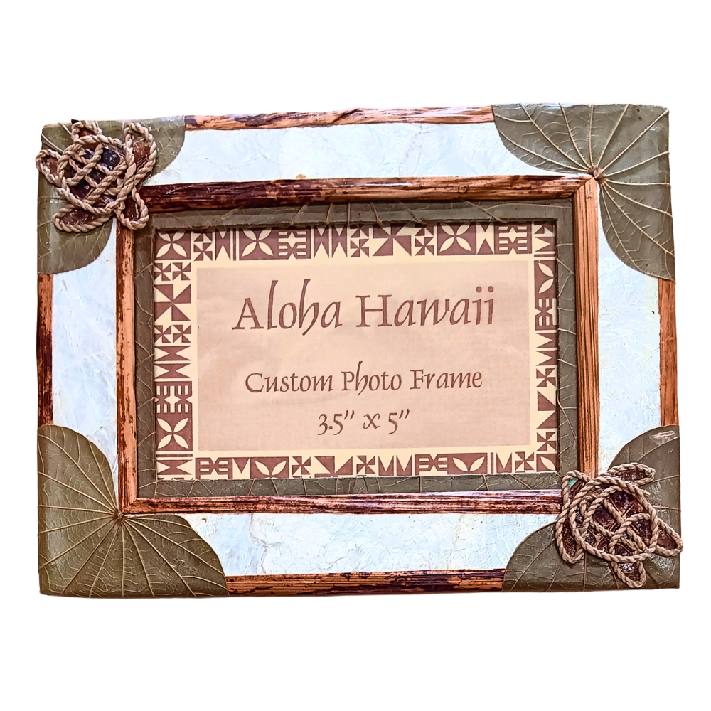 Showcase your favorite memories with this Aloha Hawaii handcrafted photo frame, beautifully designed with natural island materials. The frame features a textured background accented with real pressed leaves in each corner, capiz shell accents, plus hand-woven rope sea turtle embellishments for a unique tropical touch.