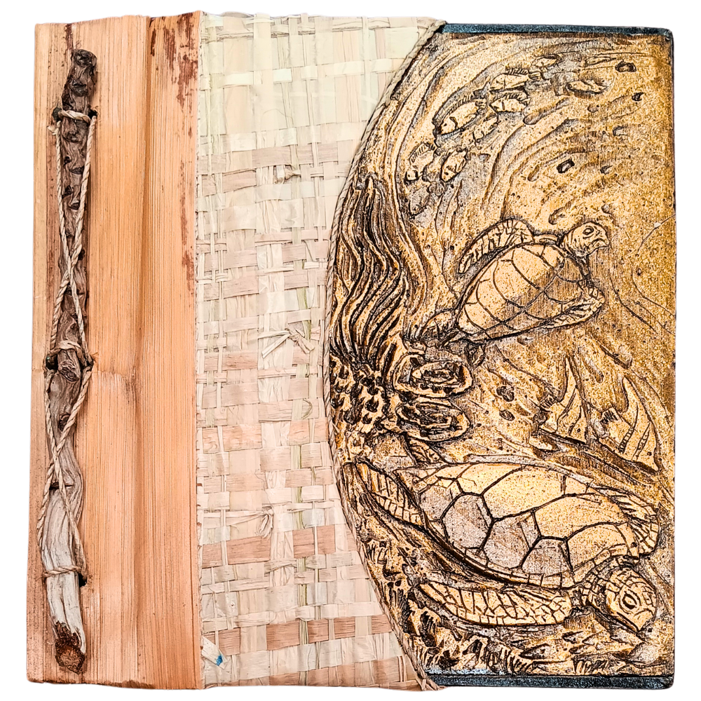Capture island memories with this handmade Hawaiian photo album featuring an intricate honu (sea turtle) ocean scene. The right side of the cover is a detailed raised graphic showing multiple turtles gliding through coral and waves—each line and texture created by skilled artisans.
