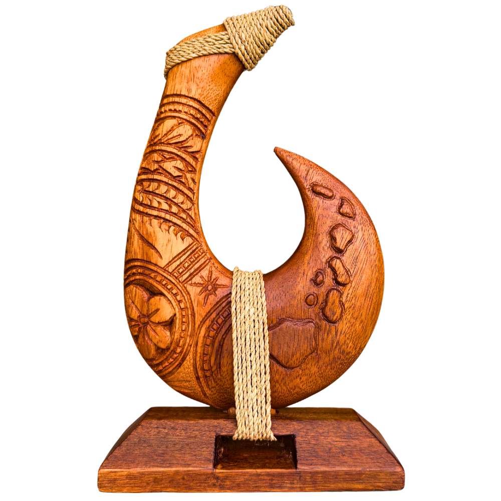 This unique 8” hand-carved Hawaiian Makau (fish hook) statue is engraved with Polynesian designs and the Hawaiian Island chain. Mounted on a solid wood base, it represents strength, protection, and deep cultural roots- perfect as decor or a meaningful gift.