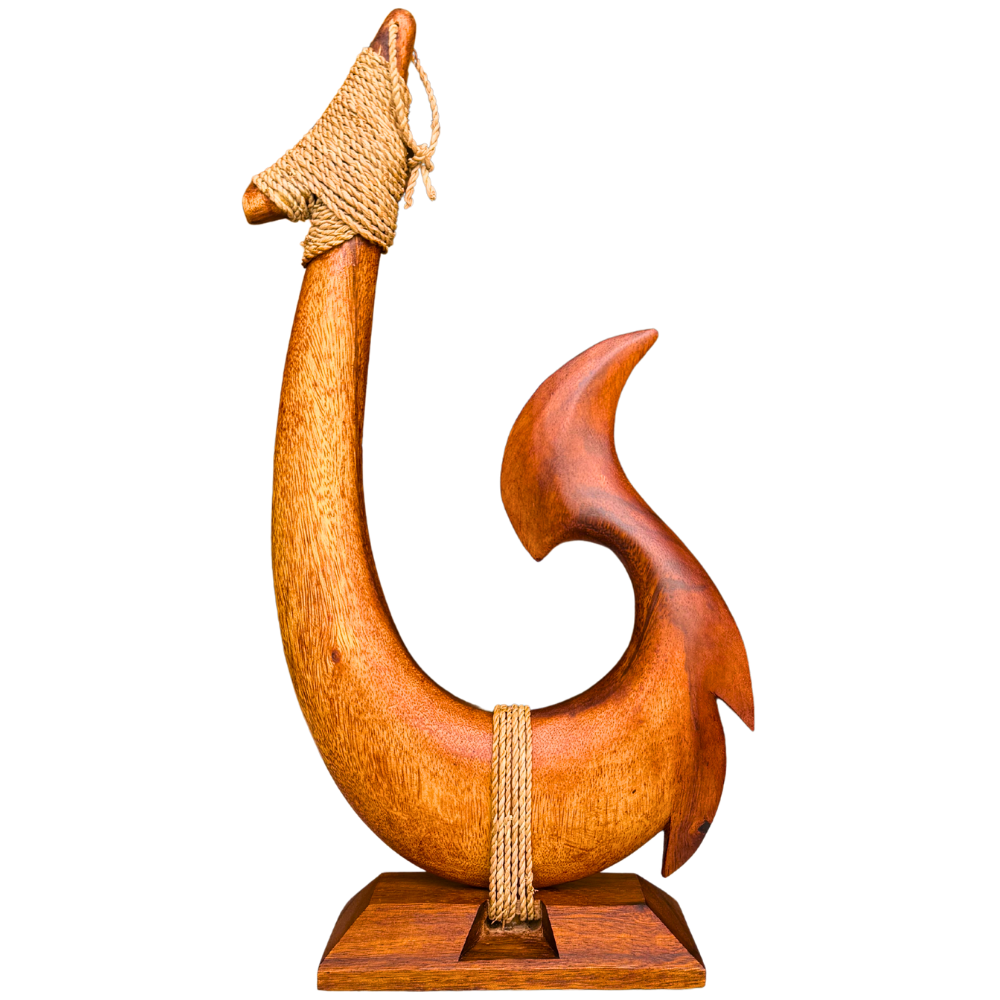 Hand-Carved 17" Hawaiian Fish Hook Statue – Natural Wood Finish on Display Stand