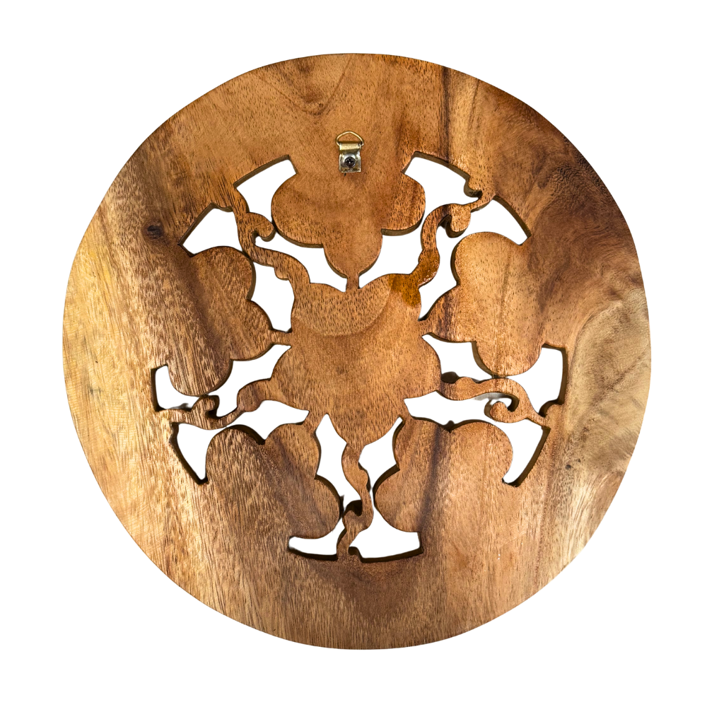 Made from natural hardwood, the plaque showcases warm golden-brown grain variations and a subtle sheen. The openwork design allows your wall color to show through the carving, adding depth and dimension. A metal hanger is installed on the back for easy wall mounting.