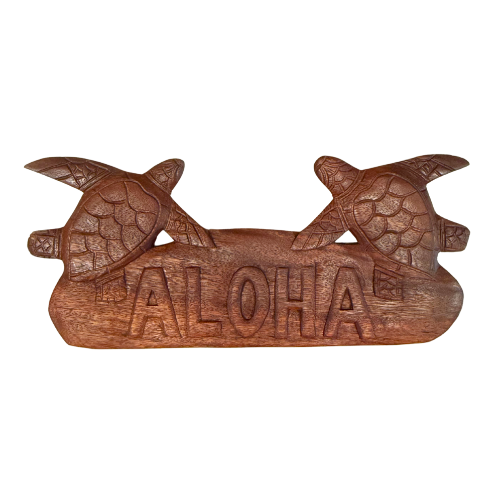 Welcome the spirit of the islands into your home with this beautifully hand-carved ALOHA sea turtle plaque, crafted from rich, natural suar wood. Each plaque features two honu (Hawaiian sea turtles) swimming gracefully above the word ALOHA, symbolizing peace, protection, and the welcoming nature of Hawai‘i.