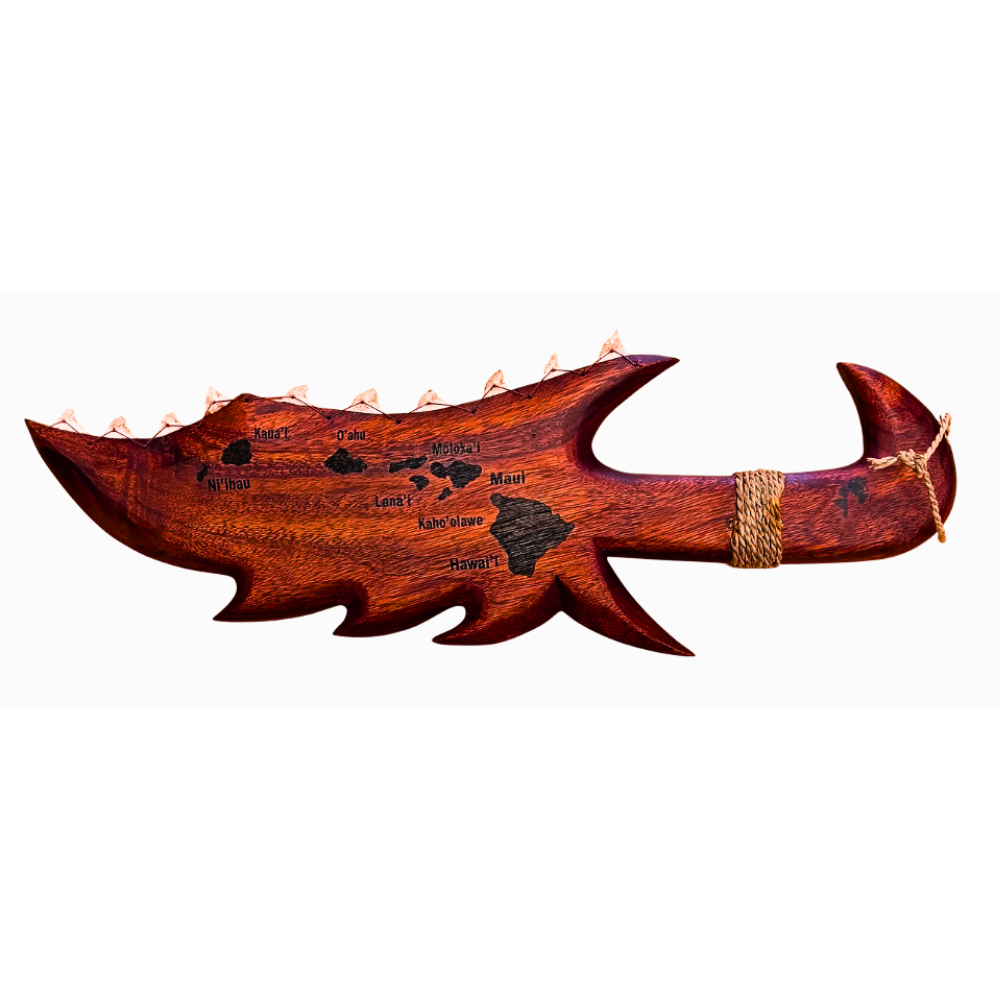 This premium Hawaiian war dagger replica is inspired by the traditional leiomano, a revered weapon and symbol of strength in Hawaiian history. Handcrafted from richly grained wood, this piece features a laser-engraved map of the Hawaiian Islands on one side, highlighted by embedded resin shark teeth along the blade edge. Finished with natural cord wrapping at the handle, it is designed as a striking cultural display piece rather than a functional weapon. Limited quantities available.