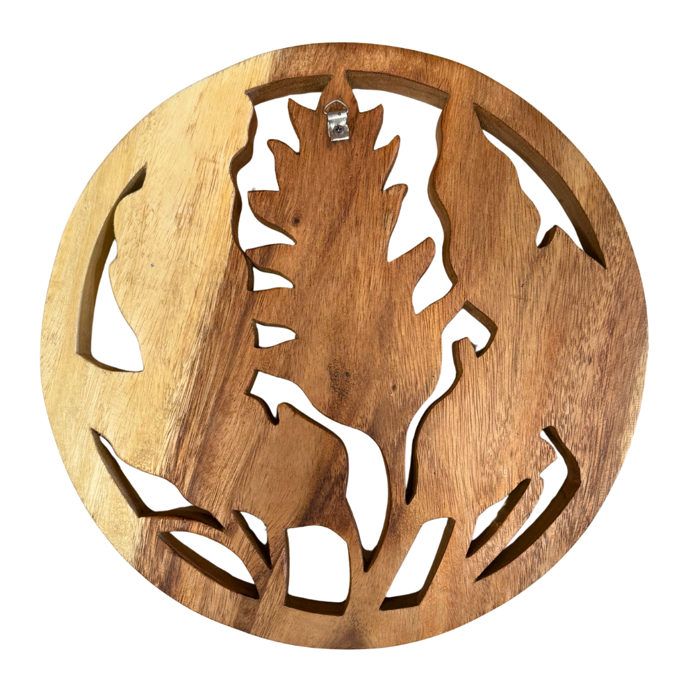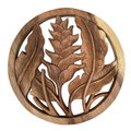 Bring the lush beauty of Hawai‘i indoors with this hand-carved banana leaf and ginger flower wall plaque, crafted from natural hardwood and finished in warm tropical tones. The circular 12-inch design features a blooming ginger flower framed by flowing leaves, each petal and vein carved with deep texture and precision.