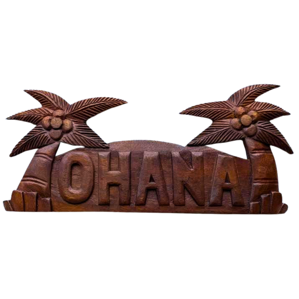 Bring the spirit of Ohana—family and togetherness—into your home with this hand-carved wooden "OHANA" plaque accented with tropical palm trees. A perfect piece for Hawaiian-themed décor, coastal living spaces, or as a meaningful island gift.
