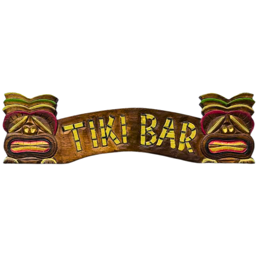 Hand-carved wood sign with “TIKI BAR” lettering