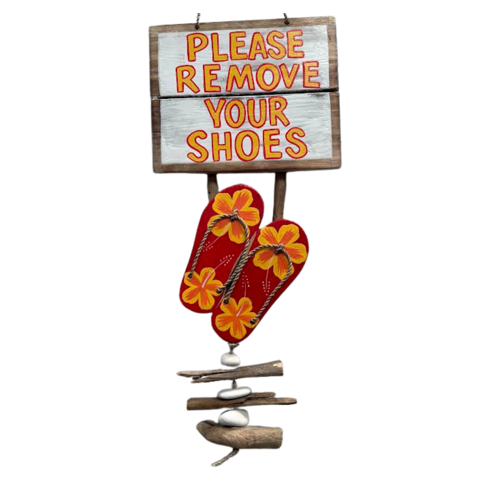 Welcome guests with island charm and a friendly reminder! This handcrafted hanging sign features a bold “Please Remove Your Shoes” message on rustic wood, accented with colorful red and yellow hibiscus flip-flops and natural driftwood pieces. Perfect for your entryway, porch, lanai, or beach house, this unique piece blends functionality with tropical style. Crafted from natural wood and hand-painted for a vibrant finish, it’s a beautiful way to keep your space sand- and dirt-free while adding a splash of Hawaiian aloha to your décor.