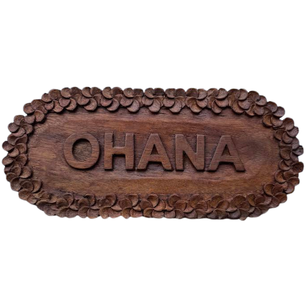 Hand-Carved “OHANA” Wood Plaque – Hawaiian Family Sign with Plumeria Lei Border